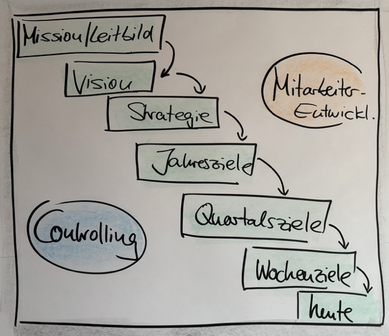 Die Vision zeigt, wo Ihr in 8 bis 10 Jahren stehen wollt – ambitioniert, aber realistisch. Eine gut formulierte Vision inspiriert, motiviert und wirkt als Kompass für tägliche Entscheidungen.